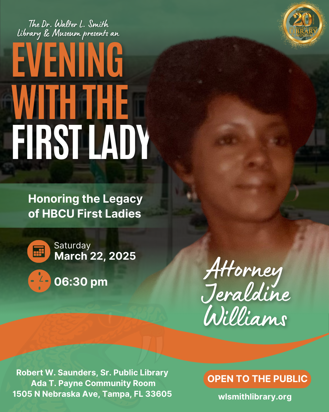For Women’s History Month, we are hosting an intimate and powerful event honoring the untold stories of HBCU First Ladies. This year, we highlight the remarkable legacy of Former First Lady of Florida A&M University, Attorney Jeraldine Williams, ex-wife of the late Dr. Walter L. Smith, former FAMU President. While HBCU presidents are often celebrated, the impact, leadership, and influence of their First Ladies remain largely unspoken.